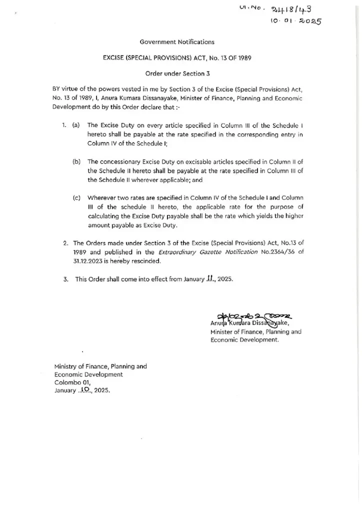 රජය විසින් විශේෂ ගැසට් නිවේදනයක් මගින් පෙබරවාරි මාසයේ සිට ආනයනය කරනු ලබන වාහන සඳහා වන ආනයන බදු ප්‍රතිශතය සදහන් කර ඇත.