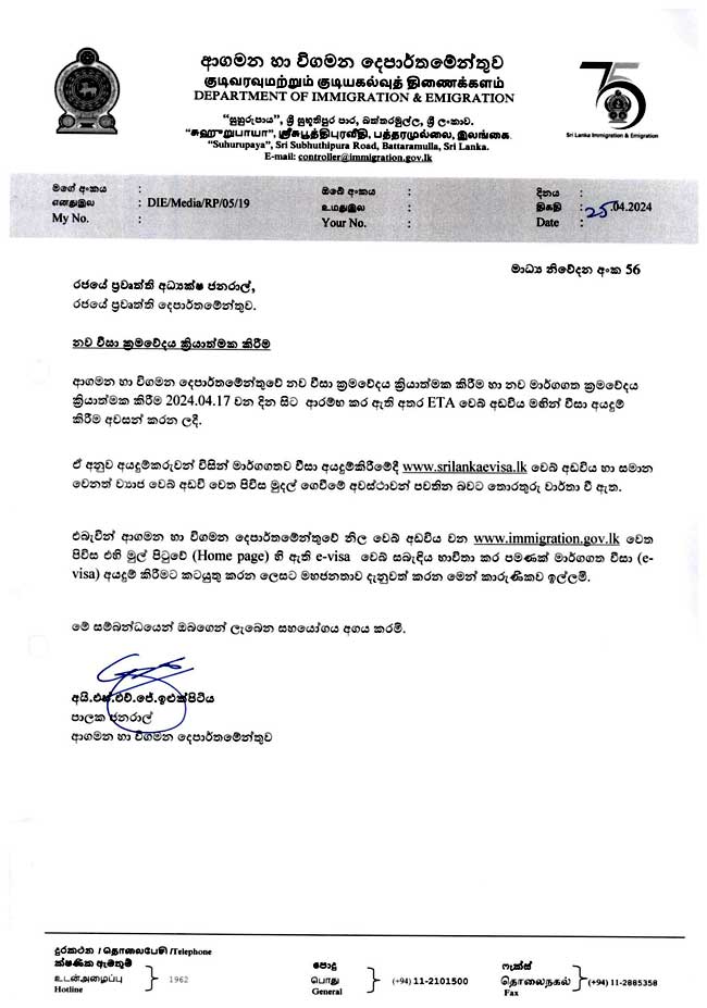 එම දෙපාර්තමේන්තුව සිය නිවේදනයෙන් වැඩිදුරටත් සඳහන් කර ඇත්තේ අප්රේල් මස 17 වනදා සිට ආගමන විගමන දෙපාර්තමේන්තුවේ නව වීසා ක්රමවේදය ක්රියාත්මක කිරීම හා නව මාර්ගගත ක්රමවේදය ක්රියාත්මක කිරීම ආරම්භ කර ඇති බවය.
