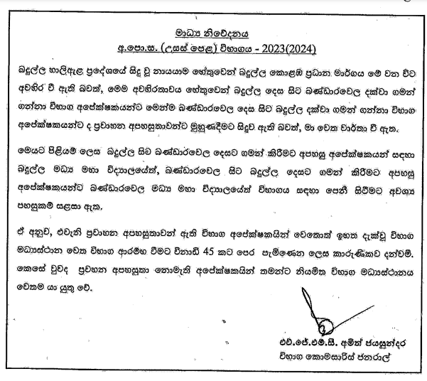 එහි දැක්වෙන්නේ බදුල්ල සිට බණ්ඩාරවෙල දෙසට ගමන් කිරීමට අපහසු උසස් පෙළ විභාග අපේක්ෂකයින්ට බදුල්ල මධ්‍ය මහා විද්‍යාලයේදී විභාගය සඳහා පෙනී සිටීමේ හැකියාව පවතින බවය.