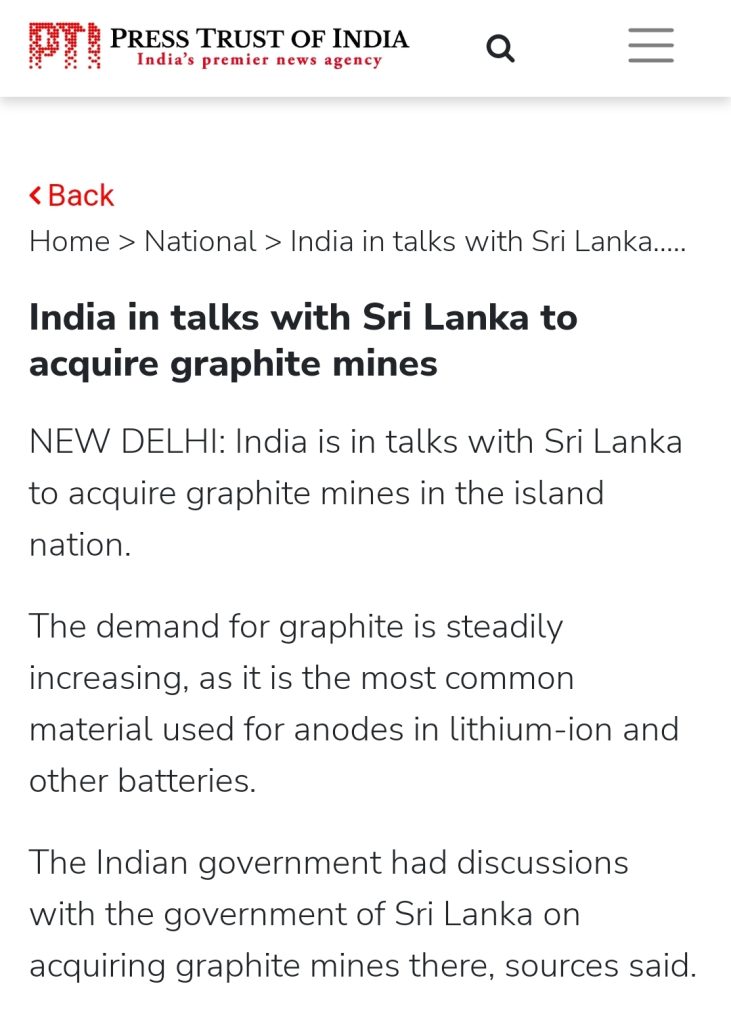 ශ්රී ලංකාවේ මිනිරන් පතල් අත්පත්කර ගැනීම සඳහා ඉන්දියාව ශ්රී ලංකාව සමඟ සාකච්ඡා කරමින් සිටින බව Press Trust of India නම් ඉන්දීය මාධ්ය වාර්තා කරයි.