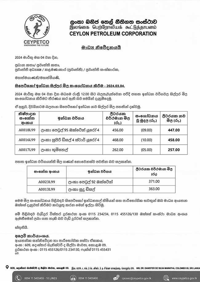 Spread the love ලංකා ඛනිජ තෙල් නීතිගත සංස්ථාව විසින් අද මධ්යම රාත්රියේ සිට ක්රියාත්මක වන පරිදි ඉන්ධන මිල පහල දමා තිබේ. Post Views: 2000 228 Post navigation වෘත්තීය පුහුණු අධිකාරියේ ආකාර්යක්ෂම තාවයෙන් මිලියන 150 ක් අහිමිවන ලකුණු. ශ්රී ලංකාවට ලකුණු 03 ක තියුණු ජයක්..