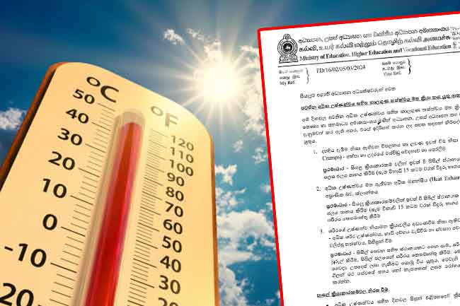 දිවයිනට බලපා ඇති අධික උෂ්ණත්වය සහිත කාලගුණ තත්ත්වය මත ක්රියාකළ යුතු ආකාරය පිළිබඳව අධ්යාපන, උසස් අධ්යාපන සහ වෘත්තීය අධ්යාපන අමාත්යංශය විසින් විශේෂ නිර්දේශ මාලාවක් නිකුත්කර තිබේ.මෙම නිර්දේශ සියලුම පළාත් ලේකම්වරුන්, අධ්යාපන අධ්යක්ෂවරුන් වෙත යොමුකර ඇත.අදාළ නිදේශ ඇතුළත් ලිපිය,