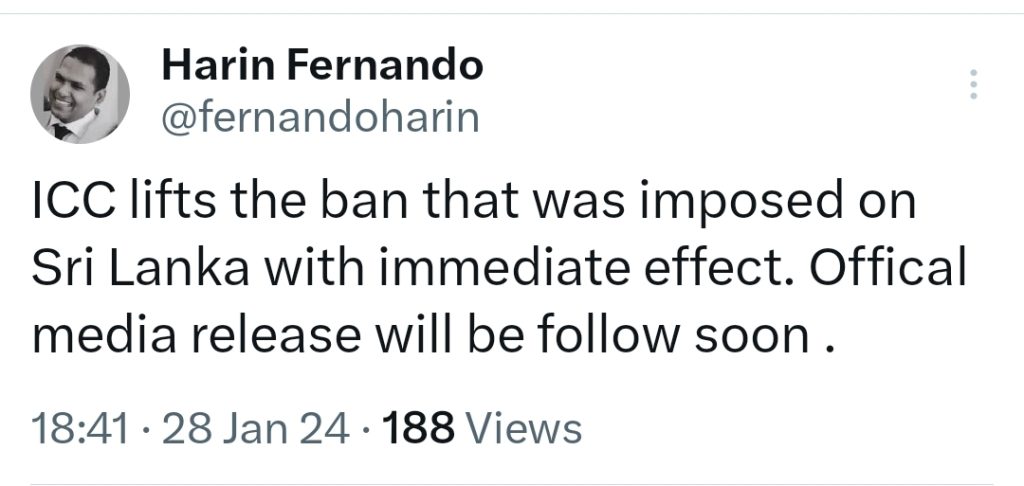 මේ සම්බන්ධයෙන් ක්රීඩා අමාත්ය හරීන් ප්රනාන්දුද X සටහනක් තබා ඇත.