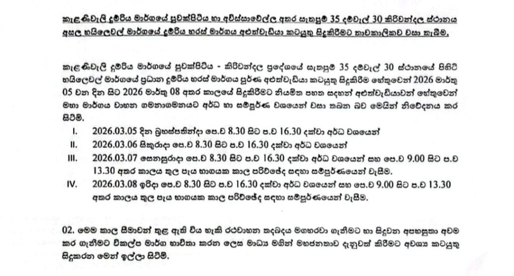 කැළණිවැලි දුම්රිය මාර්ගයේ පුවක්පිටිය හා අවිස්සාවේල්ල දුම්රිය ස්ථාන අතර දුම්රිය හරස් මාර්ගයේ අලුත්වැඩියා කටයුත්තක් හේතුවෙන් මාර්තුමස 5 දින සිට 8 වැනි දින දක්වා වසා දැමිීමට සිද වන බව දුම්රිය දෙපාර්තුමේන්තුව පවසයි.