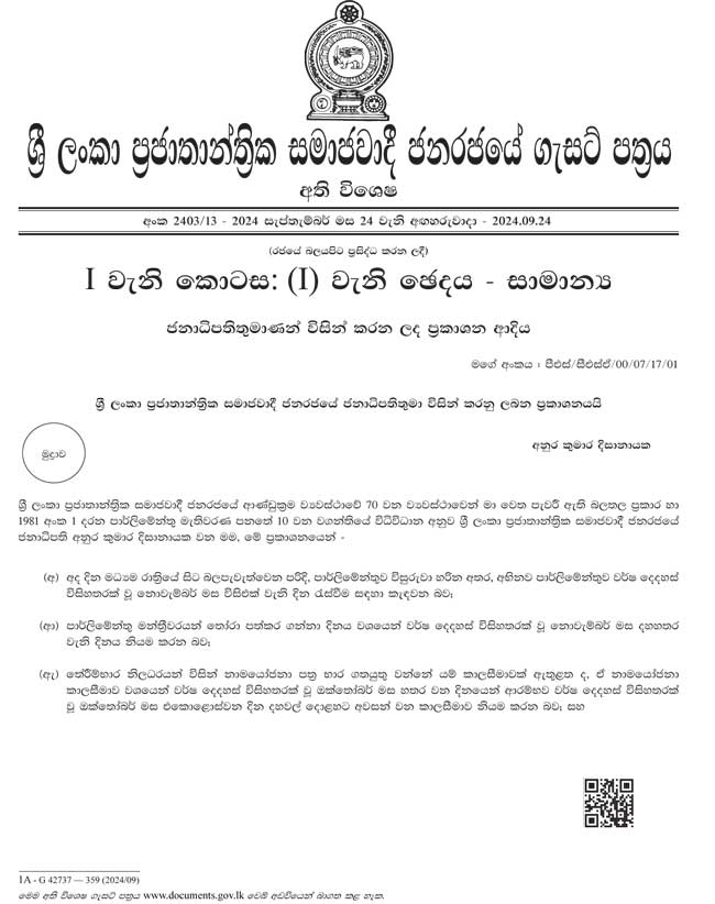පාර්ලිමේන්තුව විසුරුවා හැරීමට අදාළ ගැසට් පත්‍රයට ජනාධිපති අනුර කුමාර දිසානායක මීට සුළු මොහාතකට පෙර අත්සන් තබා ඇත.