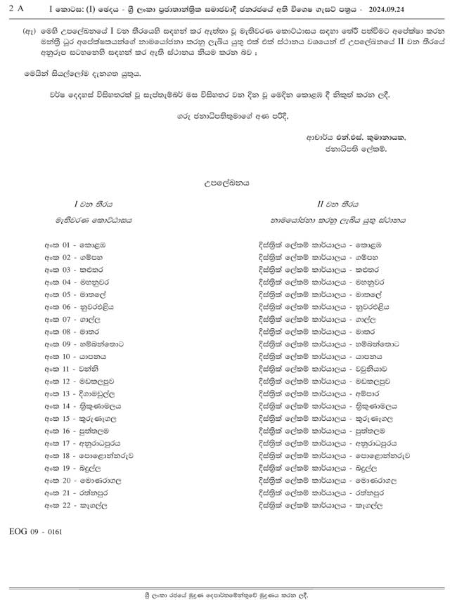 ඒ අනුව ඔක්තෝබර් මස 04 වන දින සිට ඔක්තෝබර් මස 11 වන දින දහවල් 12 දක්වා කාලය තුළ නාමයෝජනා භාරගැනීමට නියමිතය.