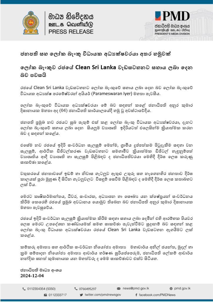 ජනාධිපති අනුර කුමාර දිසානායක සහ ලෝක බැංකුවේ විධායක අධ්‍යක්ෂවරයා අද (04) ජනාධිපති කාර්යාලයේදී හමු වූ අවස්ථාවේදී ඔහු මේ බව සඳහන් කළේය.