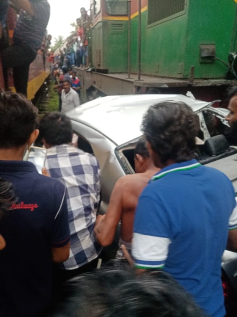 දුම්රියේ ගැටීමෙන් මෝටර් රථය හැපී මෙන් දැඩි ලෙස හානි සිදුවි තිබේ.