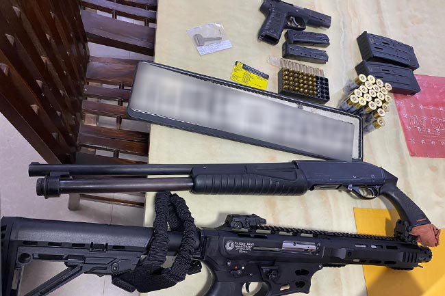 සැකකරුගේ නිවස වැඩිදුරටත් පරීක්ෂා කිරීමේදී, විදෙස් රටක නිෂ්පාදිත රිපීටර් වර්ගයේ ගිනිඅවි 02ක් හා හිස් පතරොම් ගැබ් 02ක්, විදෙස් රටක නිෂ්පාදිත පිස්තෝල වර්ගයේ ගිනිඅවියක් හා හිස් පතරොම් ගැබ් 02ක්, වාහන අංක තහඩුවක් හා රක්ෂණ කාඩ්පතක්, ගිනිඅවි බලපත්‍ර අළුත් කිරීමේ කුවිතාන්සිපත් 03ක් පොලිස් භාරයට ගෙන ඇත.