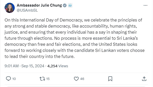 නිදහස් හා සාධාරණ මැතිවරණයක් පැවැත්වීම, ශ්‍රී ලංකාවේ ප්‍රජාතන්ත්‍රවාදය වෙනුවෙන් කළ හැකි වැදගත්ම කාර්යය බවයි X පණිවිඩයක් නිකුත් කරමින් ඇය සඳහන් කර ඇත්තේ.