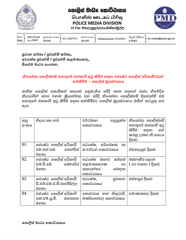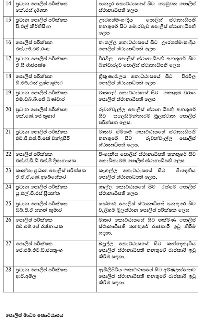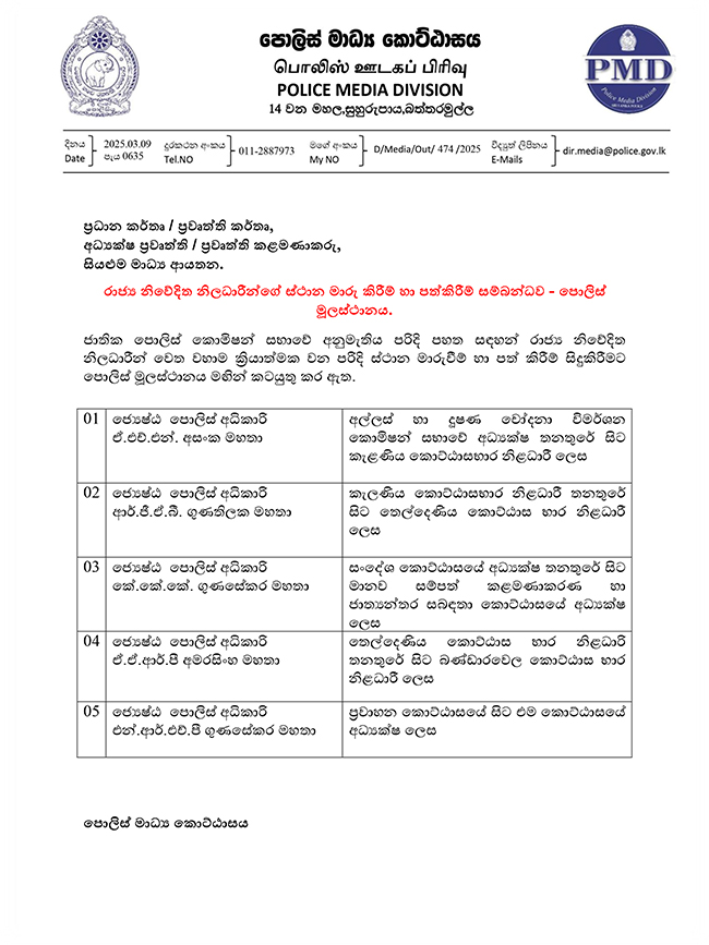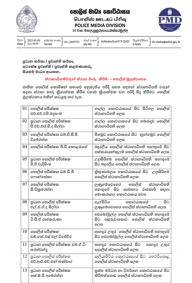 ජාතික පොලිස් කොමිෂන් සභාවේ අනුමැතිය පරිදි ජ්යෙෂ්ඨ පොලිස් අධිකාරීවරුන් සහ පොලිස් ස්ථානාධිපතිවරුන් රැසකට ස්ථාන මාරු වීම් ලබා දීමට පොලිස් මූලස්ථානය කටයුතු කර තිබේ.