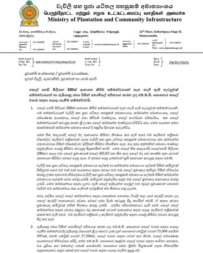වැවිලි සහ ප්රජා යටිතල පහසුකම් අමාත්යංශ ලේකම් හා කර්මාන්ත අමාත්යංශ ලේකම් විසින් පිහිටුවන ලද කමිටුවක් මගින් එම එක් එක් ආයතනය සඳහා අවශ්ය වන එම පොල් ප්රමාණය නිර්දේශ කරනු ලබන බවයි එම අමාත්යංශය සඳහන් කළේ.