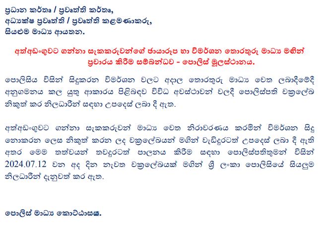 පොලීසිය විසින් සිදුකරන විමර්ශනවලට අදාළ තොරතුරු මාධ්ය වෙත ලබාදීමේදී පොලිසිය අනුගමනය කළ යුතු ආකාරය පිළිබඳව නව චක්රලේඛනයක් නිකුත් කිරීමට පොලිස්පති දේශබන්දු තෙන්නකෝන් මහතා පියවර ගෙන ඇත.