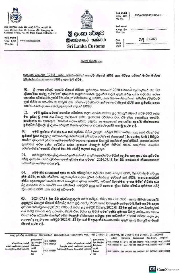 ආනයන බහාලුම් 323ක් රේගු පරීක්ෂාවකින් තොරව නිදහස් කිරීම සම්බන්ධයෙන් පළවන මාධ්ය වාර්තා පිළිබඳ විශේෂ පැහැදිළි කිරීමේ මාධ්ය නිවේදනයක් ශ්රී ලංකා රේගුව විසින් ඊයේ (29) පස්වරුවේ නිකුත් කළේය.