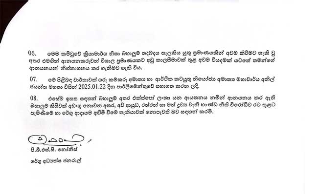 එසේම ඉහත සඳහන් බහාලුම් අතර එස්පෝ ලංකා යන ආයතනය නමින් ආනයනය කර ඇති බහාලුම් කිසිවක් අඩංගු නොවන බවත් විශේෂයෙන් සඳහන් කර ඇත.