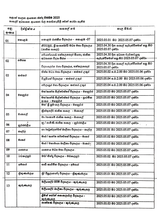 මැයි මස 7 වන දින වැසෙන පාසල්වල නම් ලැයිස්තුව පහතින් දැක්වේ.