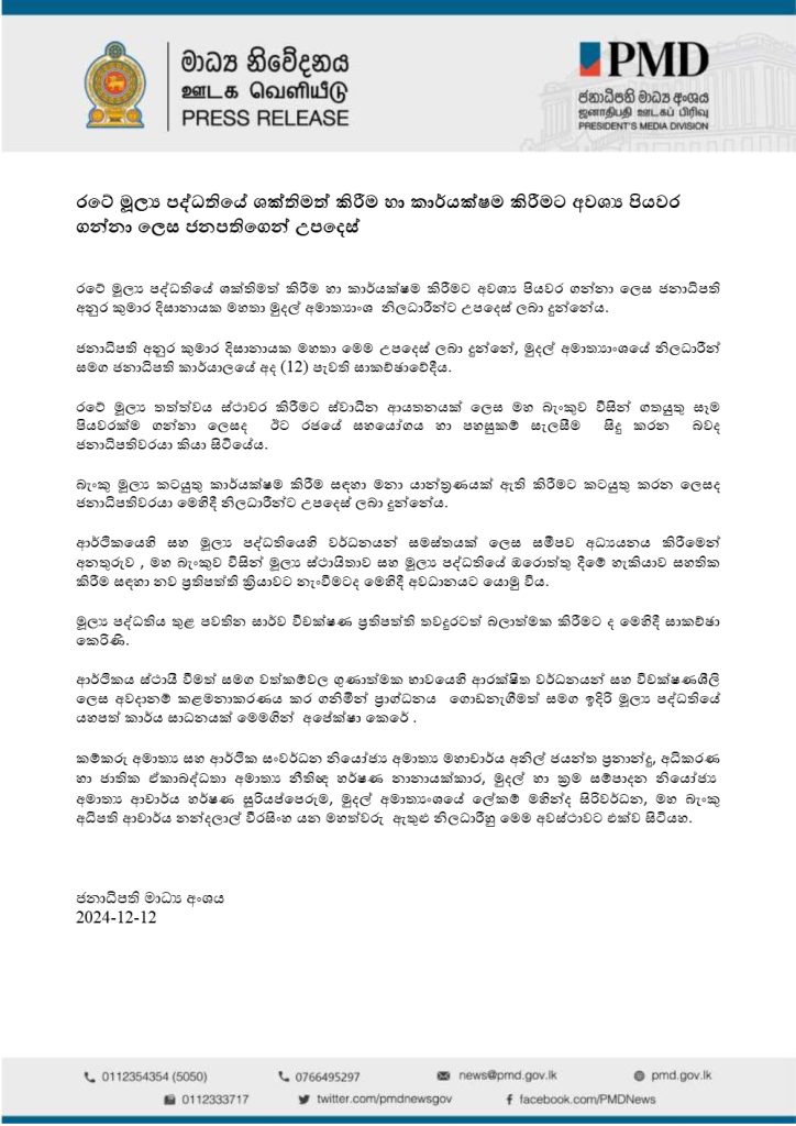 රටේ මූල්‍ය පද්ධතියේ ශක්තිමත් කිරීම හා කාර්යක්ෂම කිරීමට අවශ්‍ය පියවර ගන්නා ලෙස ජනාධිපති අනුර කුමාර දිසානායක මුදල් අමාත්‍යාංශ නිලධාරීන්ට උපදෙස් ලබා දෙයි.