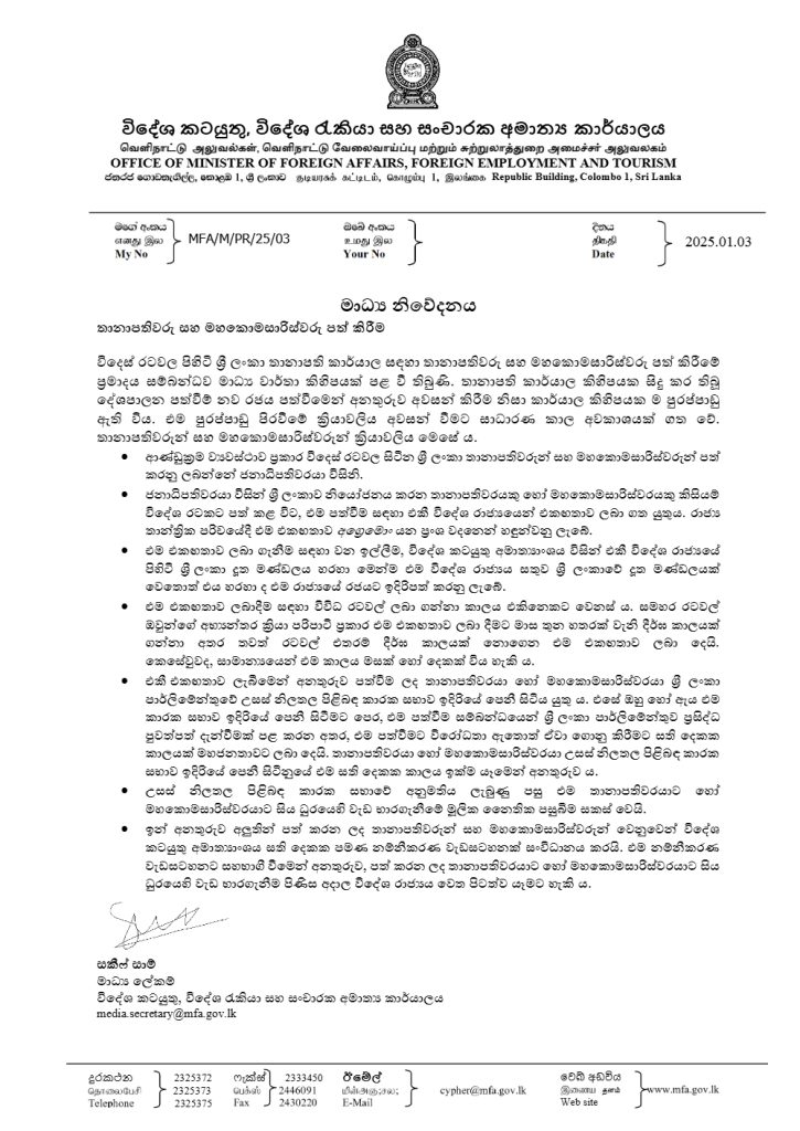 තානාපති කාර්යාල කිහිපයක සිදුකර තිබූ දේශපාලන පත්වීම් නව රජය පත්වීමෙන් අනතුරුව අවසන් කිරීම හේතුවෙන් කාර්යාල කිහිපයකම පුරප්පාඩු පවතින බවයි නිවේදනයක් නිකුත් කරමින් එම අමාත්‍යංශය සඳහන් කළේ