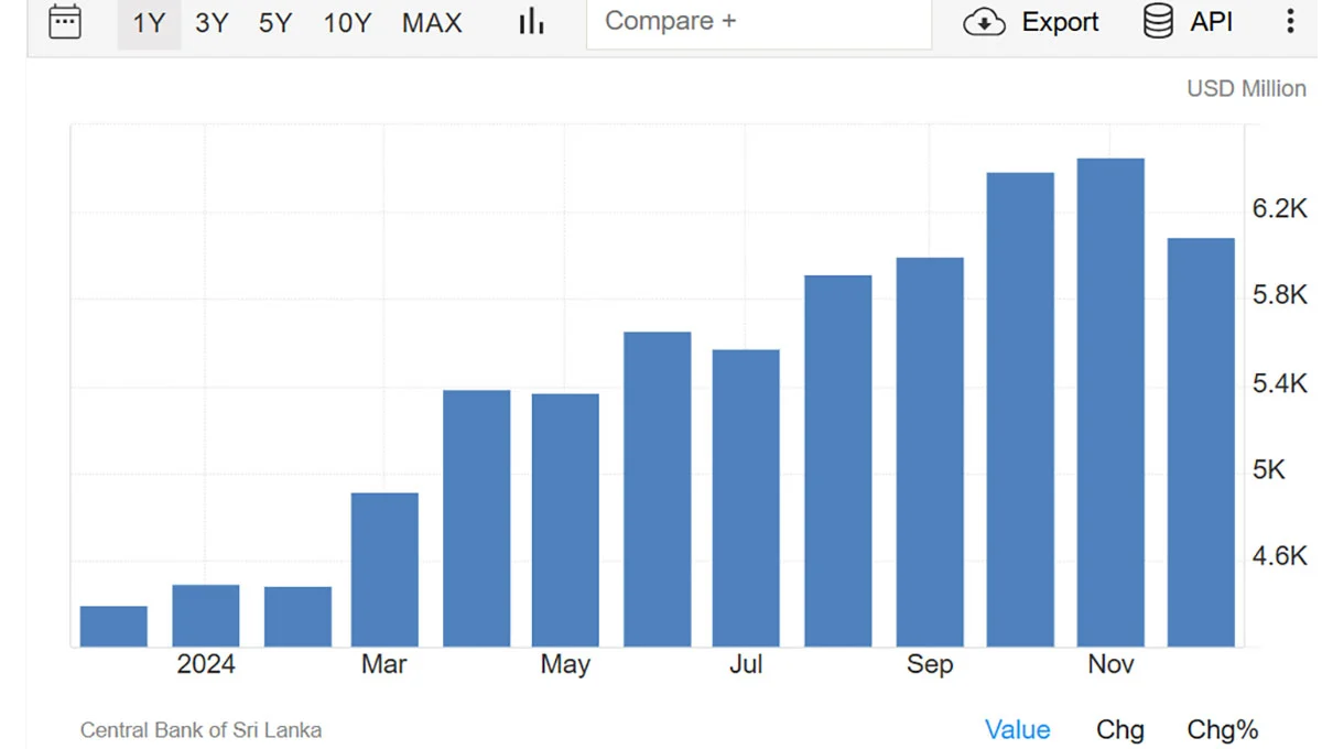 2024 නොවැම්බර් මාසයේදී ඇමරිකානු ඩොලර් මිලියන 6451 සිට දෙසැම්බර් මාසයේදී ඇමරිකානු ඩොලර් මිලියන 6091 දක්වා පහත වැටී තිබේ.