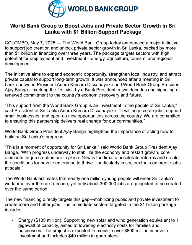 මෙරට සංචාරයේ යෙදී සිටින ලෝක බැංකු සභාපති අජේ බංගා (Ajay Banga) මහතා ශ්රී ලංකාවට අමෙරිකානු ඩොලර් බිලියනයක ආධාර පැකේජයක් ලබාදෙන බව පවසා තිබේ.