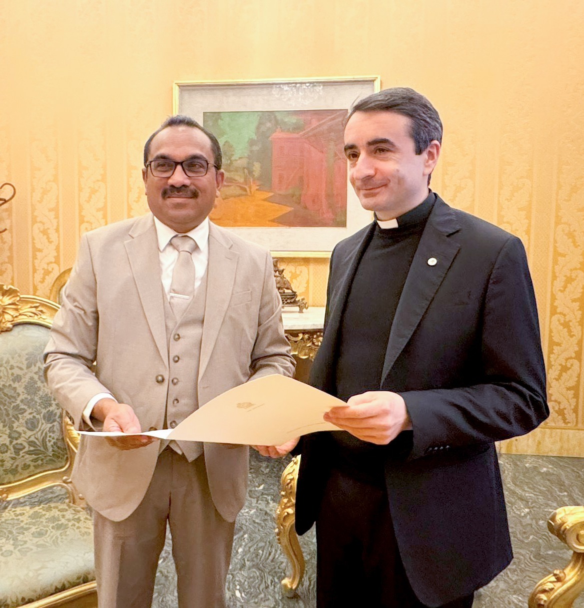 ඉතාලියේ නිල සංචාරයක නිරත අමාත්ය බිමල් රත්නායක මහතා විසින් ඊයේ (02) වතිකානයේදී රාජ්යයන් සමඟ සබඳතා පිළිබඳ උප ලේකම් මිහයිටා බ්ලාජ් පියතුමා (Msgr. Mihăiță Blaj) හමු වී මෙම නිල ආරාධනා පත්රය භාර දෙන ලදී.