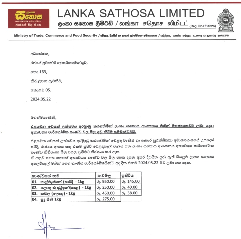 එළැඹෙන වෙසක් උත්සවය අරමුණු කරගනිමින් ලංකා සතොස ආයතනය භාණ්ඩ කිහිපයක මිල අඩු කර ඇත.