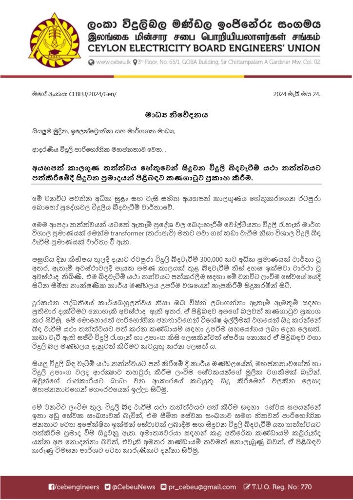 පවතින අයහපත් කාලගුණ තත්ත්වය හේතුවෙන් සිදුවන විදුලි බිඳවැටීම් යථා තත්ත්වයට පත්කිරීමේ දී සිදුවන ප්‍රමාදයන් පිළිබඳව කනගාටුව ප්‍රකාශ කරමින් ලංකා විදුලිබල මණ්ඩල ඉංජිනේරු සංගමය විසින් නිවේදනයක් නිකුත් කරයි.