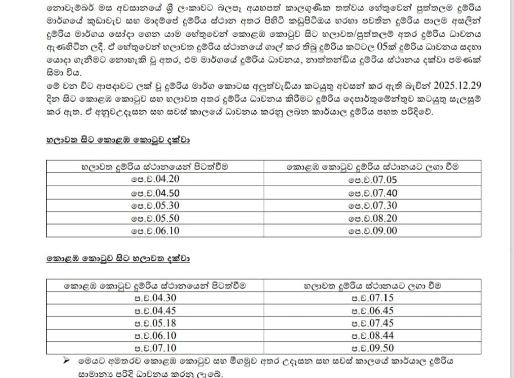 පුත්තලම් දුම්රිය මාර්ගයේ හෙට(29) සිට හලාවත සිට කොළඹ කොටුව දක්වා දුම්රිය ධාවනය සුපුරුදු පරිදි ධාවනය කෙරෙන බව දුම්රිය දෙපාර්තුමේන්තුවේ මාධ්ය ප්රකාශක අසංක සමරසිංහ මහතා පවසයි.