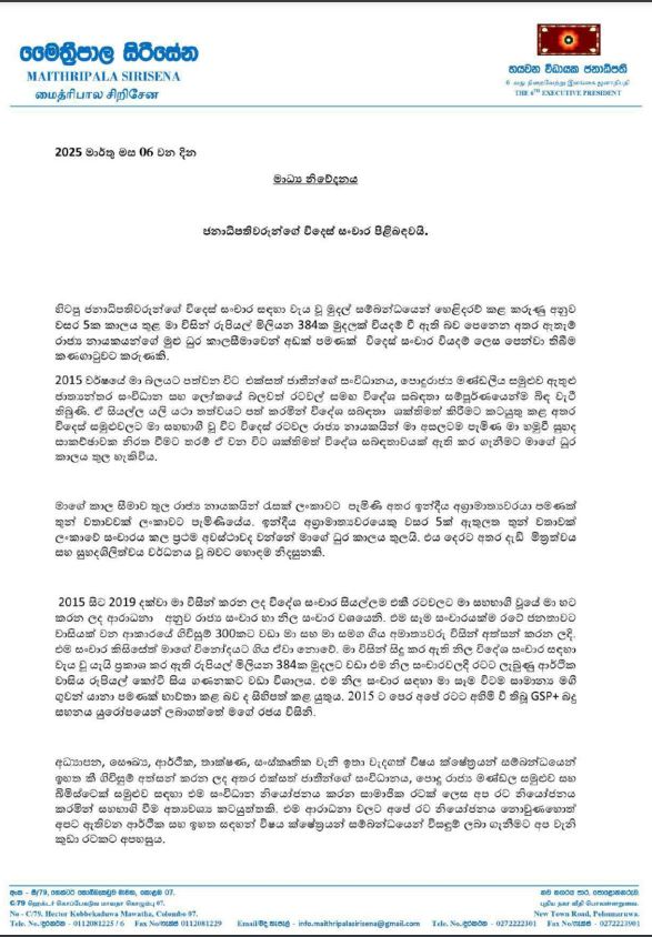 වසර 05ක කාලය තුළ තමා විසින් රුපියල් මිලියන 384ක් වියදම් කර ඇති බවට පෙනී ගියද, ඇතැම් රාජ්ය නායකයන්ගේ මුළු ධුර කාලයෙන් අඩක් පමණක් විදෙස් සංචාර වියදම් ලෙස පෙන්වා තිබීම කනගාටුවට කරුණක් බවයි නිවේදනයක් නිකුත් කරමින් හිටපු ජනාධිපතිවරයා පෙන්වා දෙන්නේ.