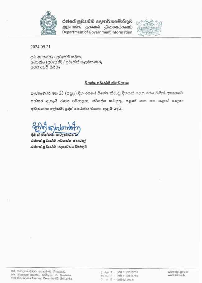 සැප්තැම්බර් 23 රජයේ විශේෂ නිවාඩු දිනයක් ලෙස ප්රකාශයට පත්කර තිබේ.